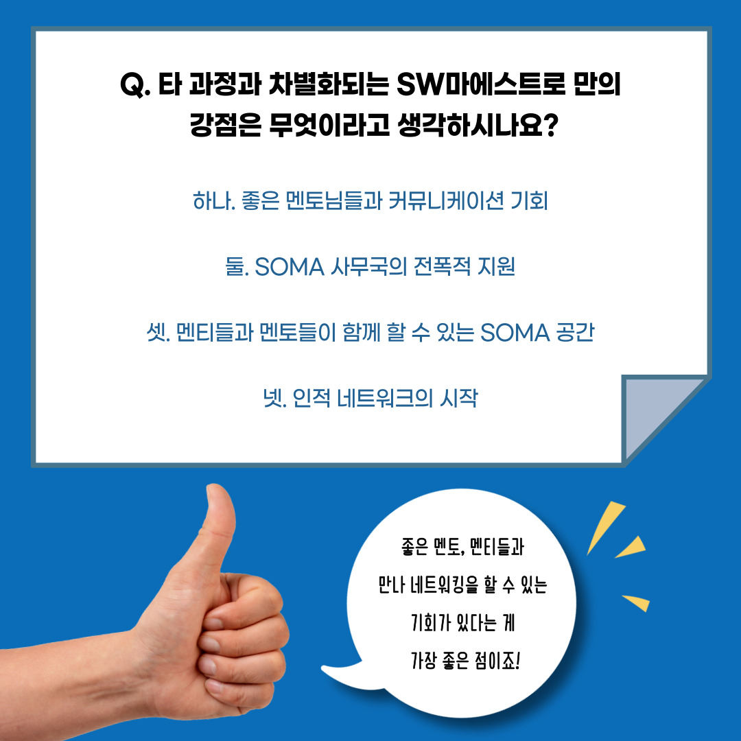 SOMA 센터 분들과 여러 멘토들이 어떻게 해야 여러분들이 더 잘 할 수 있을지 고민한 결과이기 때문에 큰 강점이라고 생각합니다.