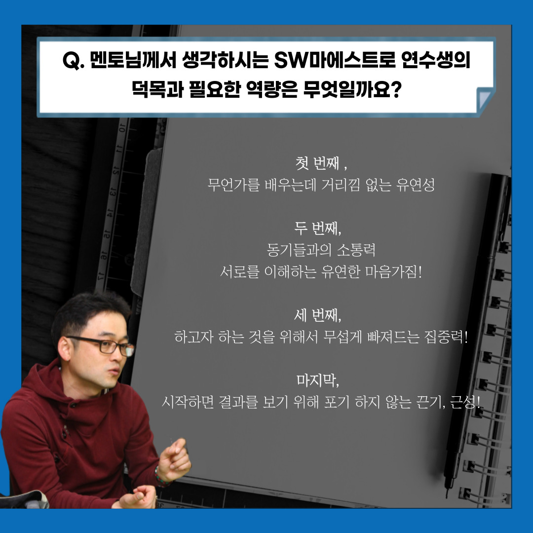 Q. 멘토님께서 생각하시는 SW마에스트로 연수생의 덕목과 필요한 역량은 무엇일까요?