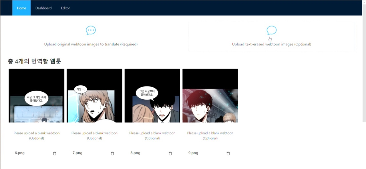 포토샵 작업과 번역 작업 등 많은 작업이 필요하기 때문에 저희는 인공지능을 도입해서 작가의 인력과 시간을 단축할 수 있도록 했습니다. 작가가 웹툰을 업로드하면 인공지능이 자동으로 글자를 번역하고 외국어 웹툰 이미지를 만들어 주기도 하며