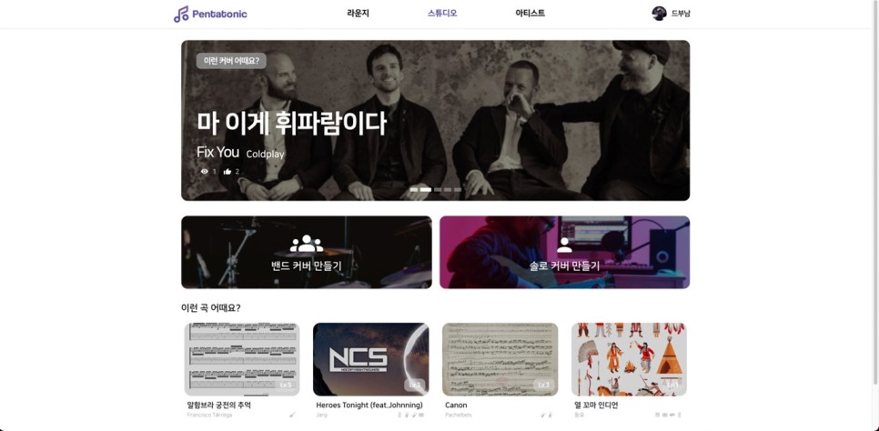 다양한 커버가 합쳐져 ‘펜타토닉’에서 하나의 온라인 밴드로 탄생하는 거죠.