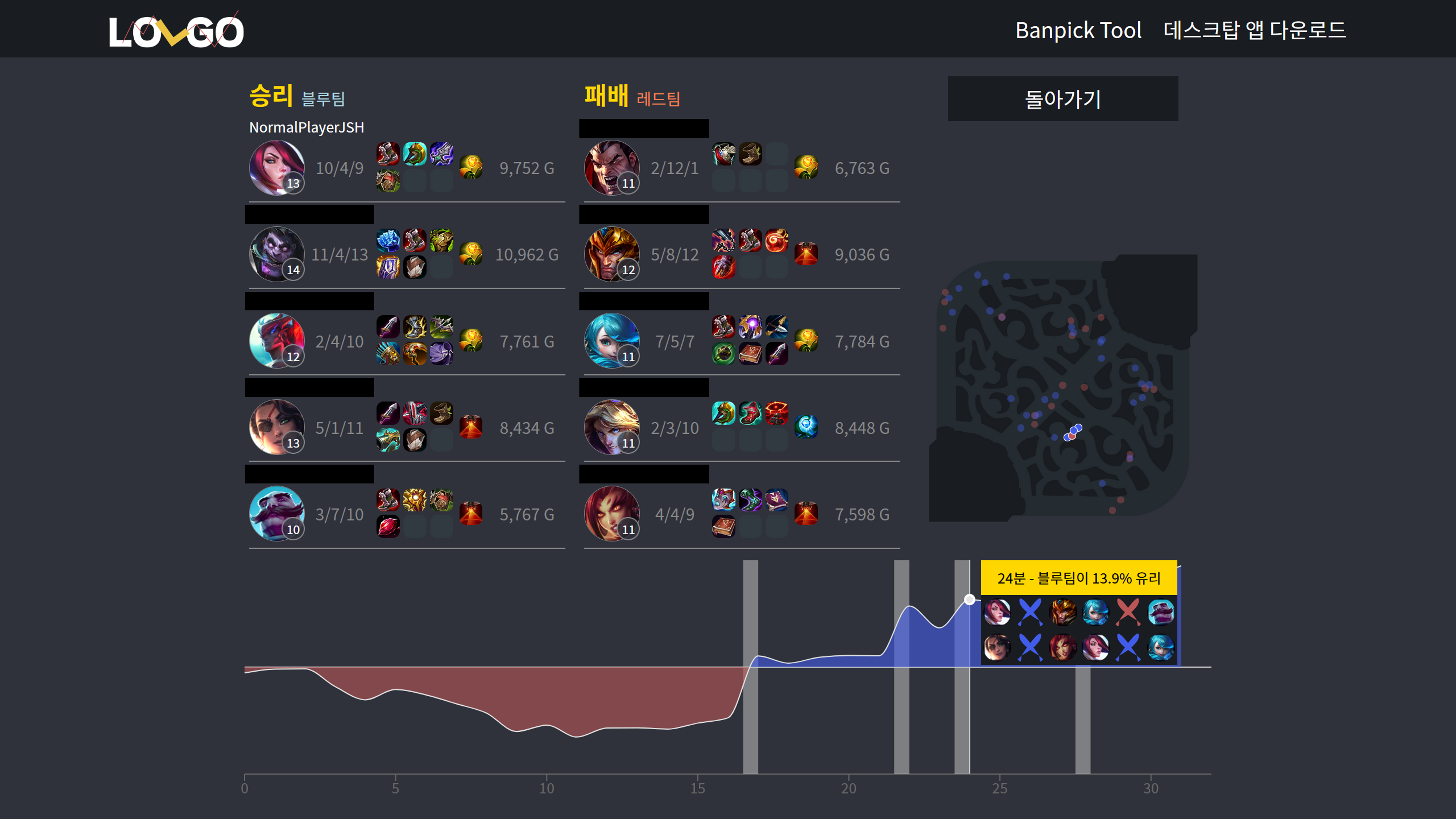 골드, 킬, 타워, 오브젝트 등의 데이터를 분석하여 해당 게임의