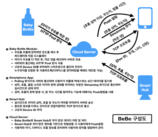 아기의 건강, 식사, 잠자리 등을 한 번에 관리하여 부모에게 알려줄 수 있는 H/W, S/W 통합 솔루션인 것이죠! BeBe팀은 그 이름처럼 아기들의 특성에 집중했습니다.