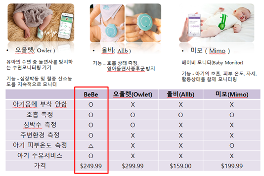 사실 BeBe와 유사한 서비스가 기존에 존재하고 있습니다. 아기들의 호흡이나 심박수를 측정하거나, 아기의 피부온도를 측정하여 부모에게 실시간으로 알려주는 서비스들이죠.
