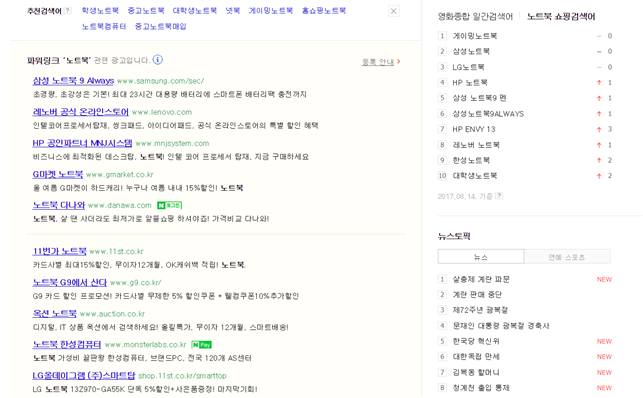 이해를 돕기위해서 한 가지 예를 들어 보겠습니다. 예를 들어서 한 포털에서 검색창에 노트북 이라고 검색하면 아래와 같은 검색 결과가 나옵니다.