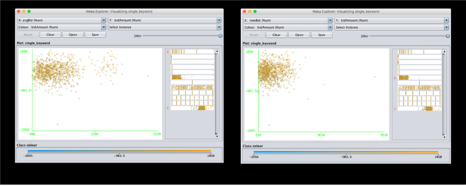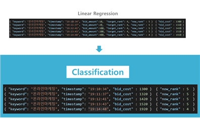 위와 같이 하나의 키워드에 대해 같은 시간대에 같은 목표로 향하는 비딩 데이터를 통합시키는 과정을 통해 한 키워드의 순위 변경에 필요한 최소 비딩가격 증감액을 데이터로 축소합니다.