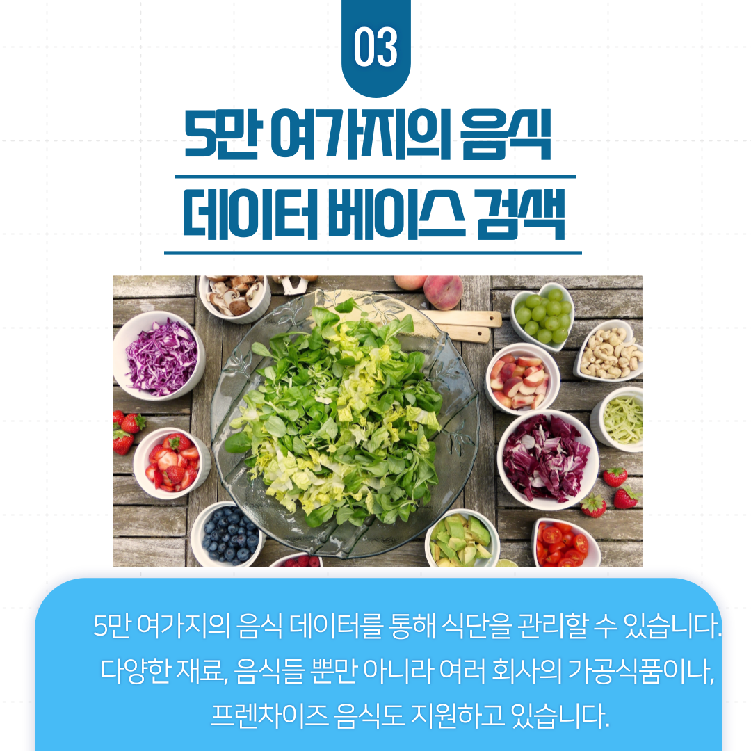5만여 가지의 음식 데이터를 통해 식단을 관리할 수 있습니다.