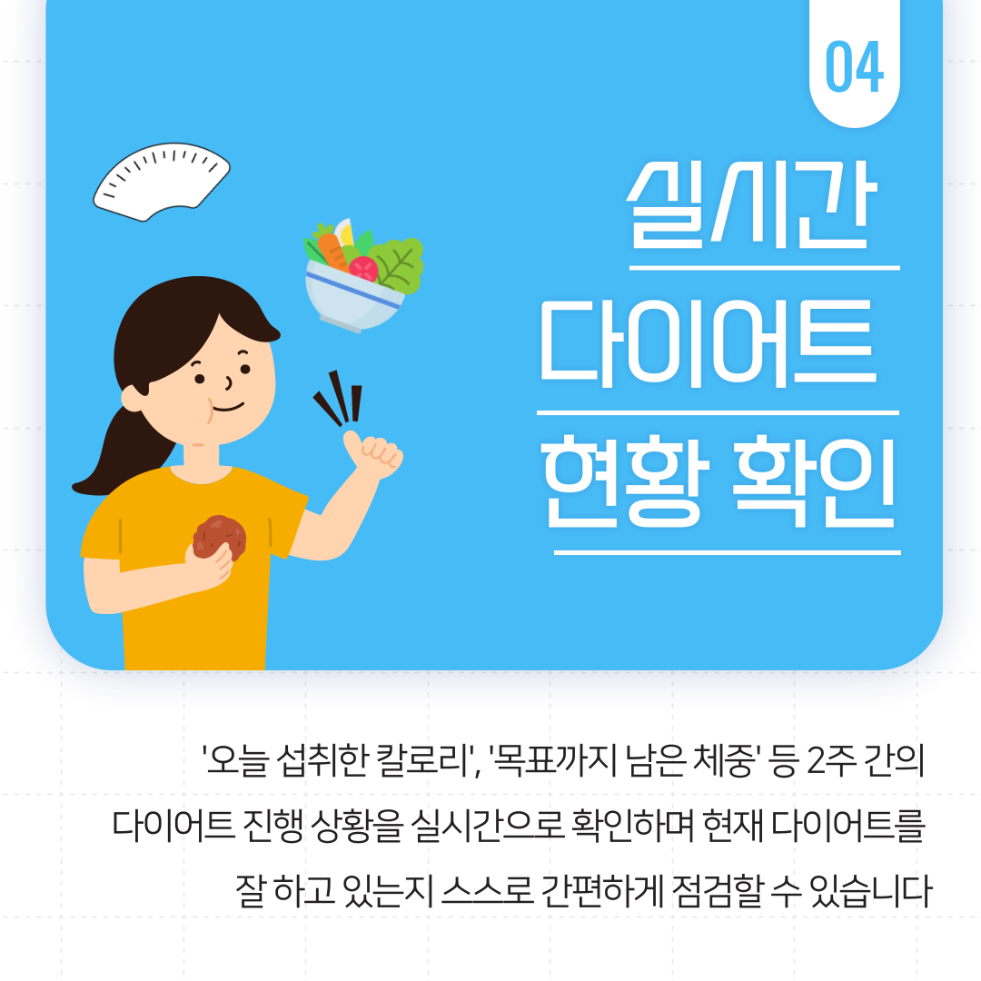 현재 다이어트를 잘 하고 있는지 스스로 간편하게 점검할 수 있습니다.