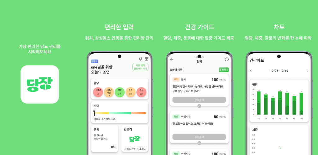 ‘당장’은 당뇨를 편리하게 기록하고 개선시킬 수 있도록 가이드를 제공하는 서비스입니다.