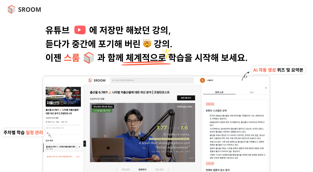 - 스룸에서는 유튜브 강의를 자신의 코스대로 담아서 관리할 수 있어요