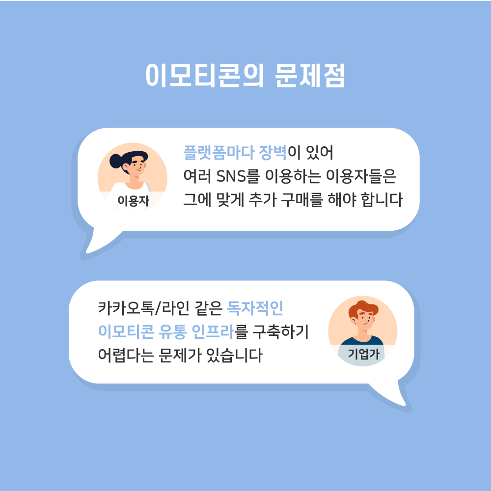 예컨대 내가 좋아하는 이모티콘을 어디에서 사용하려면 플랫폼마다 장벽이 있을 수 있습니다.
