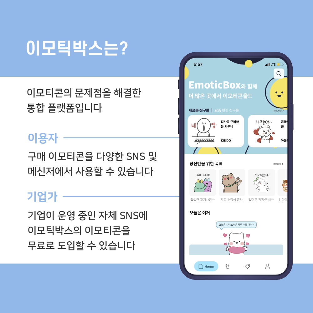 기업가 입장에서는 기업이 운영중인 자체 SNS에 이모틱박스의 이모티콘을 무료로 도입할 수 있는 장점이 생겼습니다.