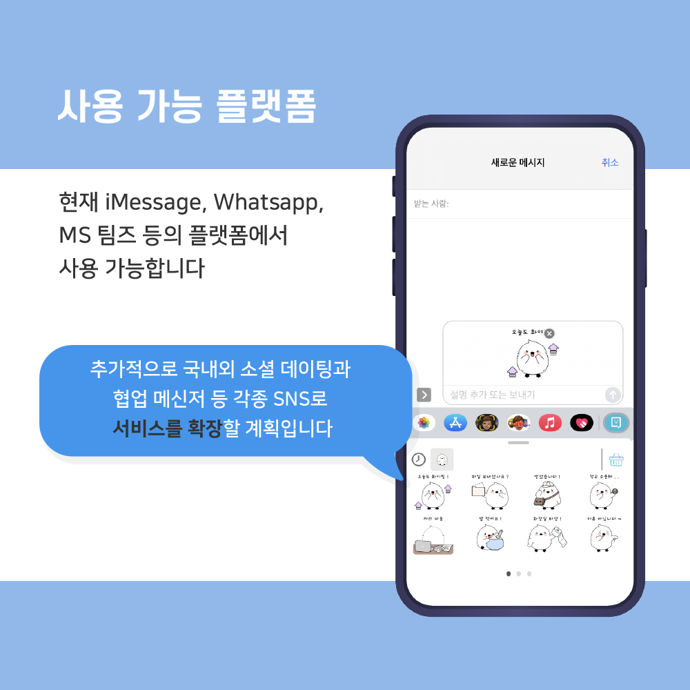 현재 이모틱박스는 iMessage와 Whatsapp, MS 팀즈 등의 다양한 플랫폼에서 사용 가능합니다.